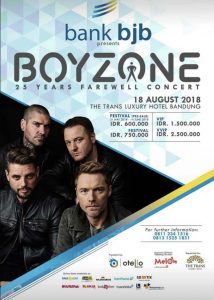 Bandung jadi kota pertama tur konser perpisahan Boyzone. Di selenggarakan pada 18 Agustus 2018 di Trans Luxury Hotel Bandung, konser ini dipastikan akan membawa banyak kenangan manis, sekaligus menjadi konser ucapan selamat tinggal bagi para penggemarnya di Indonesia. Apalagi, Boyzone berencana untuk kembali ke studio dan merilis album baru sebagai tribute untuk salah satu personelnya Stephen Gately yang meninggal di tahun 2009. Dan tentu saja album ini akan menjadi album terakhir Boyzone.