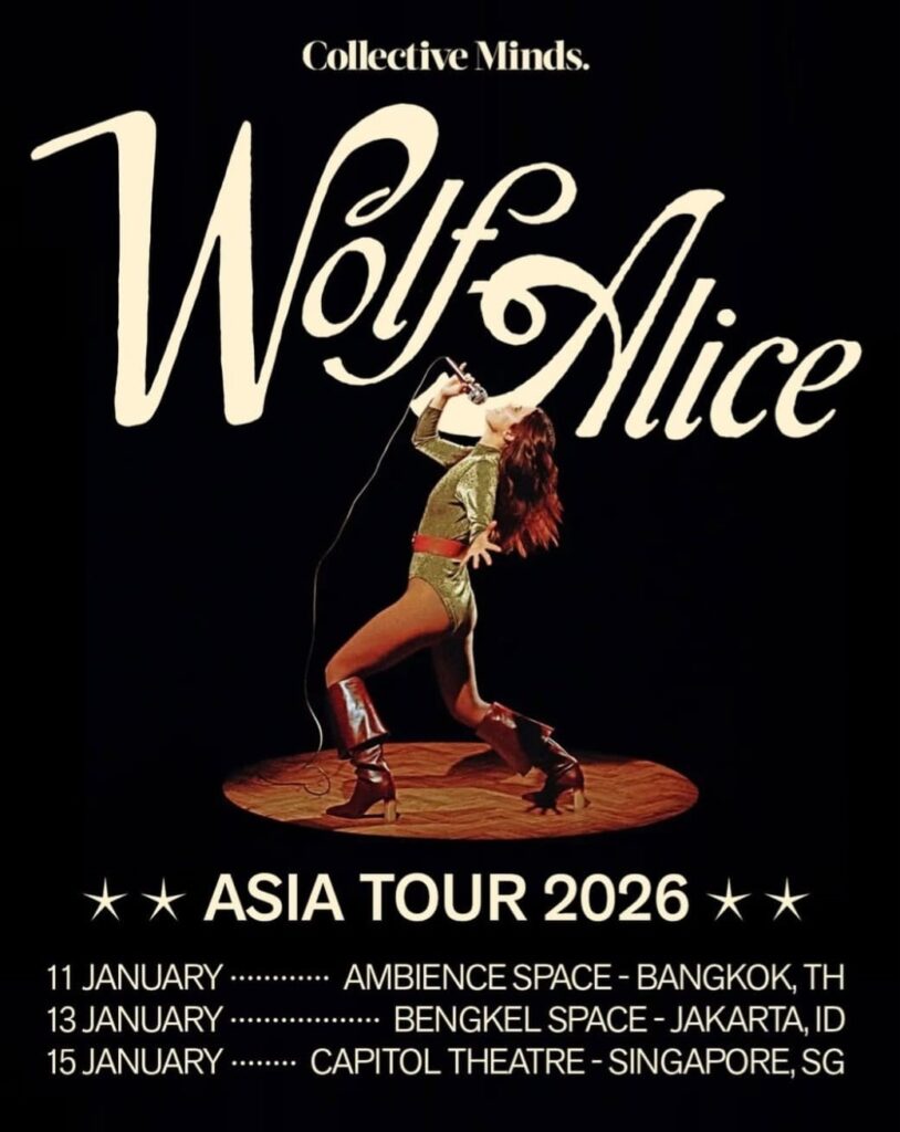 Dalam rangkaian tur Dunia di Asia mereka, Wolf Alice lebih dulu menyambangi Bangkok (11 Januari), lalu Jakarta, sebelum menutup perjalanan di Singapura (15 Januari). Konser di Jakarta yang dipersembahkan oleh Collective Minds ini jadi kesempatan langka menyaksikan langsung fase terbaru dari band yang konsisten mendobrak batas rock kontemporer. Dipimpin oleh Ellie Rowsell (vokal/gitar), bersama Joff Oddie (gitar), Theo Ellis (bas), Joel Amey (drum) dan musisi tambahan Ryan Malcolm (keyboard), Wolf Alice tampil solid sejak detik pertama.